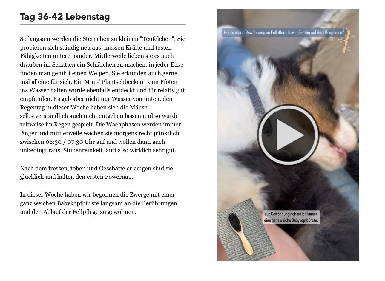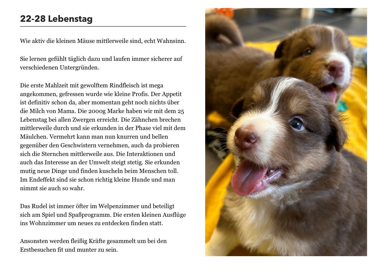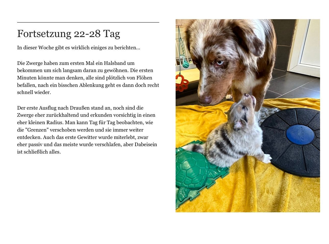 Die ersten Spielsachen und Motorikmatten finden nun Platz in der Wurfbox. Mit ca. 2,5 Wochen wird die Wurfbox um einen Welpenauslauf erweitert, damit noch mehr Platz zum erkunden und entdecken ist.