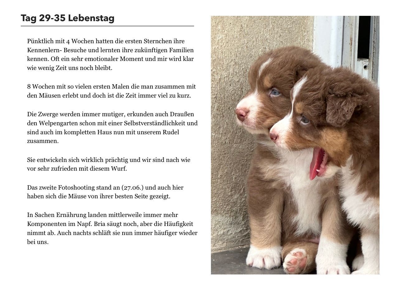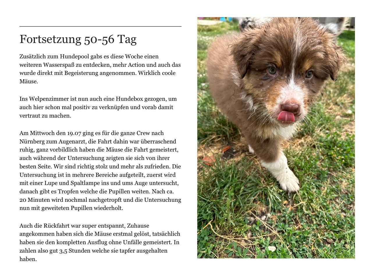 Mit Beginn der 4 Woche starten wir mit den Erstbesuchen und jede Familie kann in Ruhe Zeit mit den Mäusen verbringen. Sobald alle Familien zu Besuch gewesen sind und sich selbst ein Bild von den Welpen machen konnten, geht es Richtung Ende der 4 Lebenswoche langsam an die "Zuteilung" der Welpen.