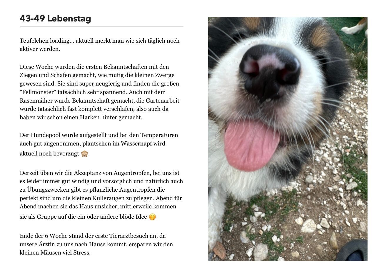 Mittlerweile werden die Welpen immer eigenständiger und die Entdeckungstouren immer länger. Neben den Schafen und Ziegen kennen unsere Welpen auch Katzen, welche nicht selten mit durch den Welpengarten streifen. Die vielen verschiedenen Untergründe, welche die Welpen kennenlernen machen sie immer trittfester und sicherer in ihrer Motorik.