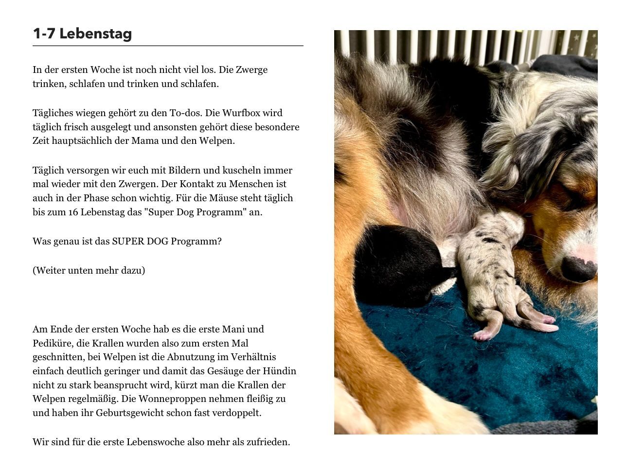 Unsere Sternchen werden in unserem Welpenzimmer in einer geräumigen und kuschligen Wurfbox geboren und verbringen die ersten Lebenswochen in Ruhe und ohne Stress mit der Mama. Können also völlig entspannt ankommen, fleißig trinken und viel kuscheln. Zwischen dem 1-16 Lebenstag starten wir das "Super Dog Programm" um möglichst wesensfeste, stressresistente Welpen zu fördern.